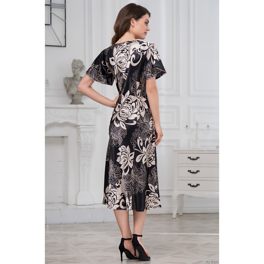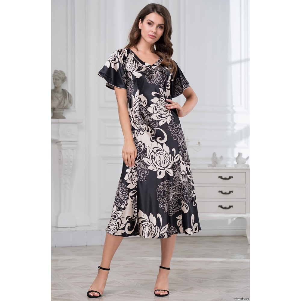 Елегантна довга сорочка "Да Вінчі" 8448 від Mia-Amore зі штучного принтованого шовку. Сорочка приталена, розкльошена до низу, з двома рельєфними лініями спереду і ззаду, для додання ще більшої жіночності силуету. Ефектні розкльошені рукави - реглан по нижньому краю декоровані тонким кантом. Оздоблення ліфа прикрашена кантом і витонченим двоколірним бантиком з підвіскою у вигляді чорних кристалів. Склад 100% поліестер