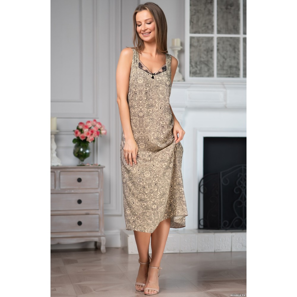Елегантна довга сорочка з колекції "Домініка" 1268 від Mia-Amore виконана з прінтована тканої віскози. Декольте сорочки декоровано розкішної вишивкою на тюлі та бантиком з підвіскою у вигляді пензлика. Рельєфні шви витончено підкреслюють жіночний силует. Склад: 100% віскоза