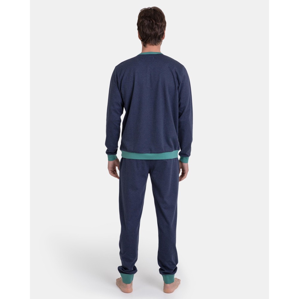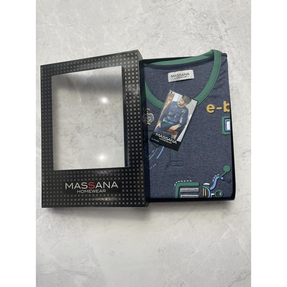 Піжама чоловіча збрюками Massana P731330 виготовлена ​​з бавовняної тканини. Комплектскладається з кофти з довгими рукавами, манжети та нижня частина виробудекоровані зеленою тканиною. Горловина джемпера застібається на гудзики. Брюкитемно-синього кольору прямого крою.Склад: 80%бавовна, 20% поліестер.