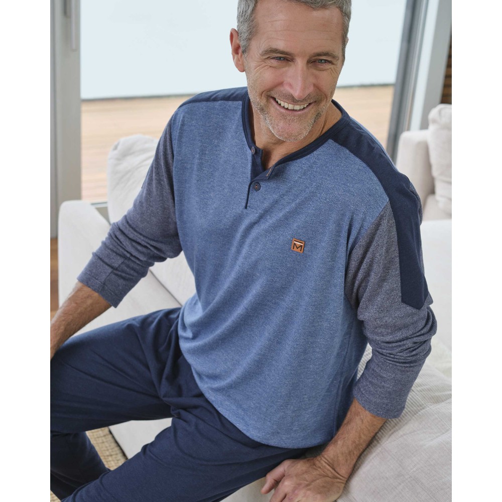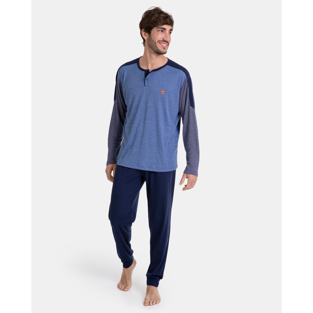 Стильна піжама із брюками Massana P731333. Комплект складається з джемпера з довгими рукавами, горловина застібається на гудзики. Брюки прямого крою темно-синього кольору.Склад: 50% бавовна, 50% поліестер.