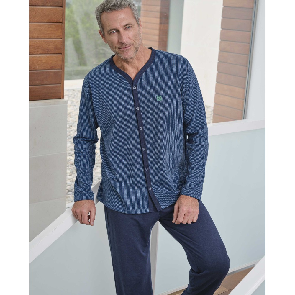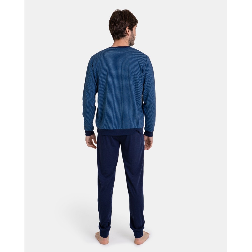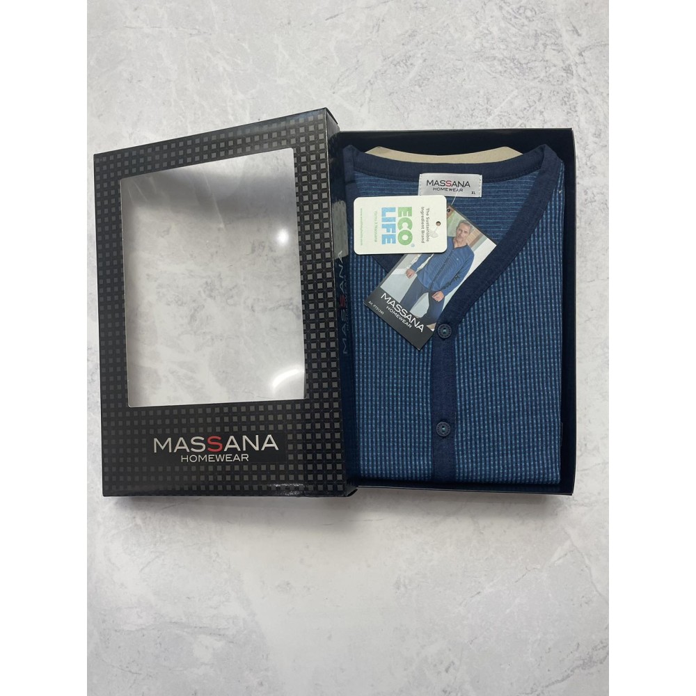 Піжама чоловіча збрюками Massana P731340 виробництво Іспанія. Комплект складається із джемперасорочкового типу з довгими рукавами. Брюки прямого крою темно-синього кольору.Склад: 50%бавовна, 50% поліестер.
