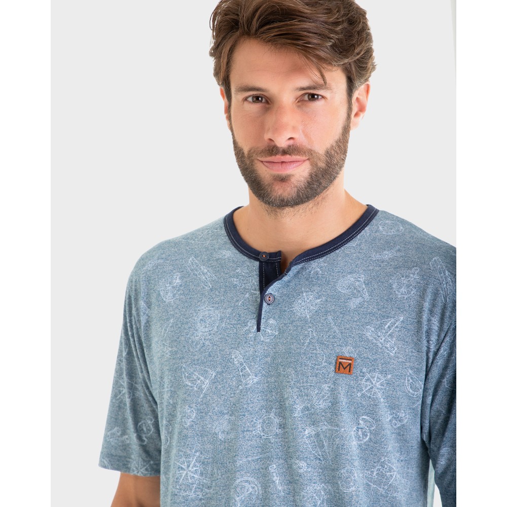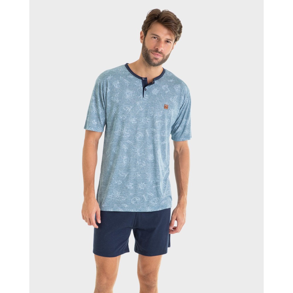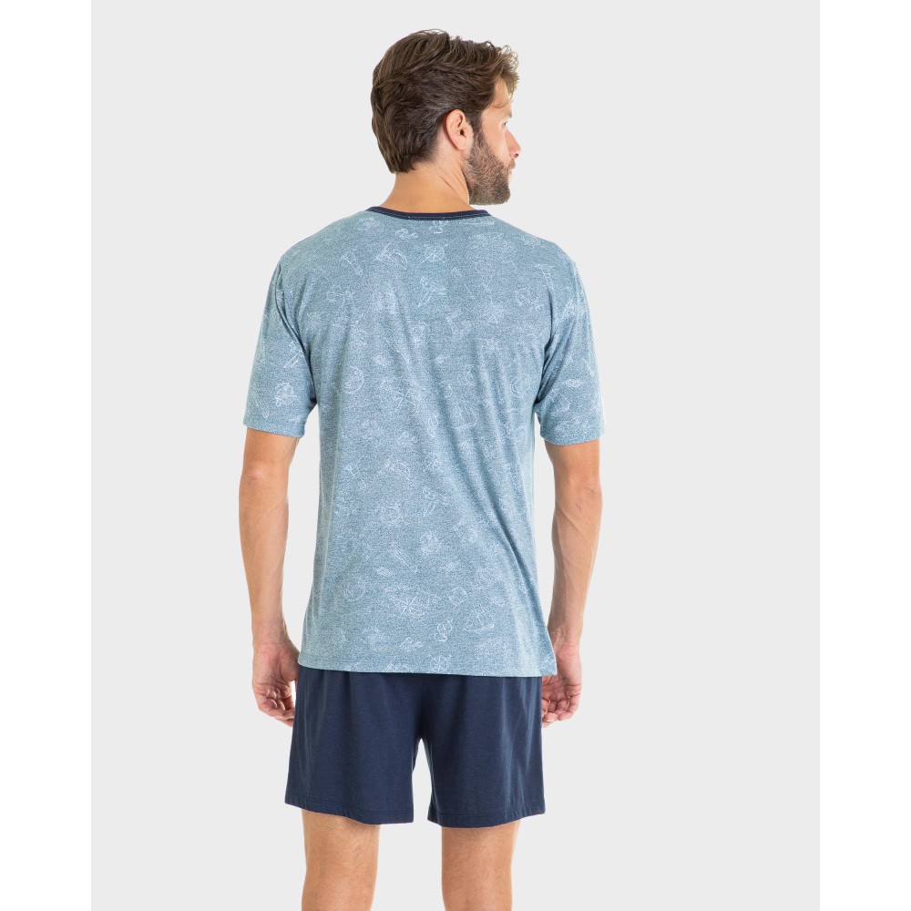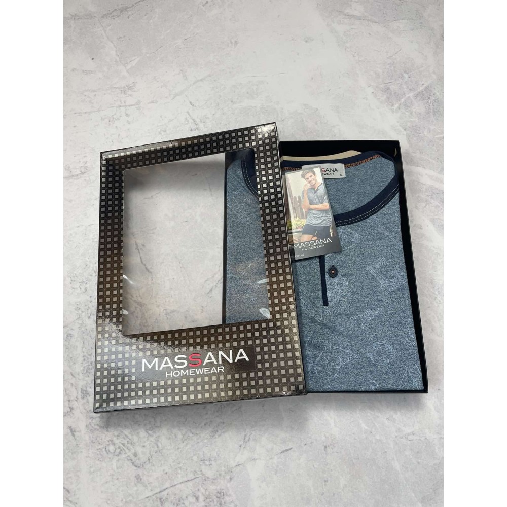 Чоловіча піжамаMassana P231312 складається з футболки з короткими рукавами та круглим вирізом.Шорти із регульованою талією.Склад: 50%віскоза, 50% поліестер.