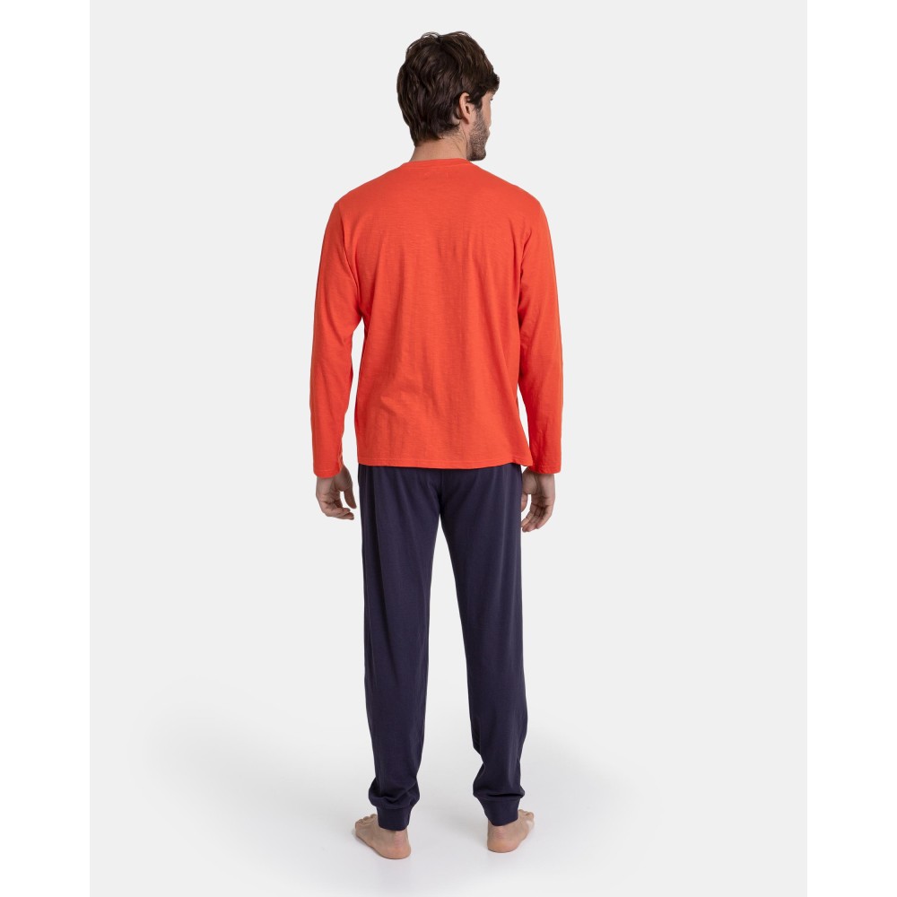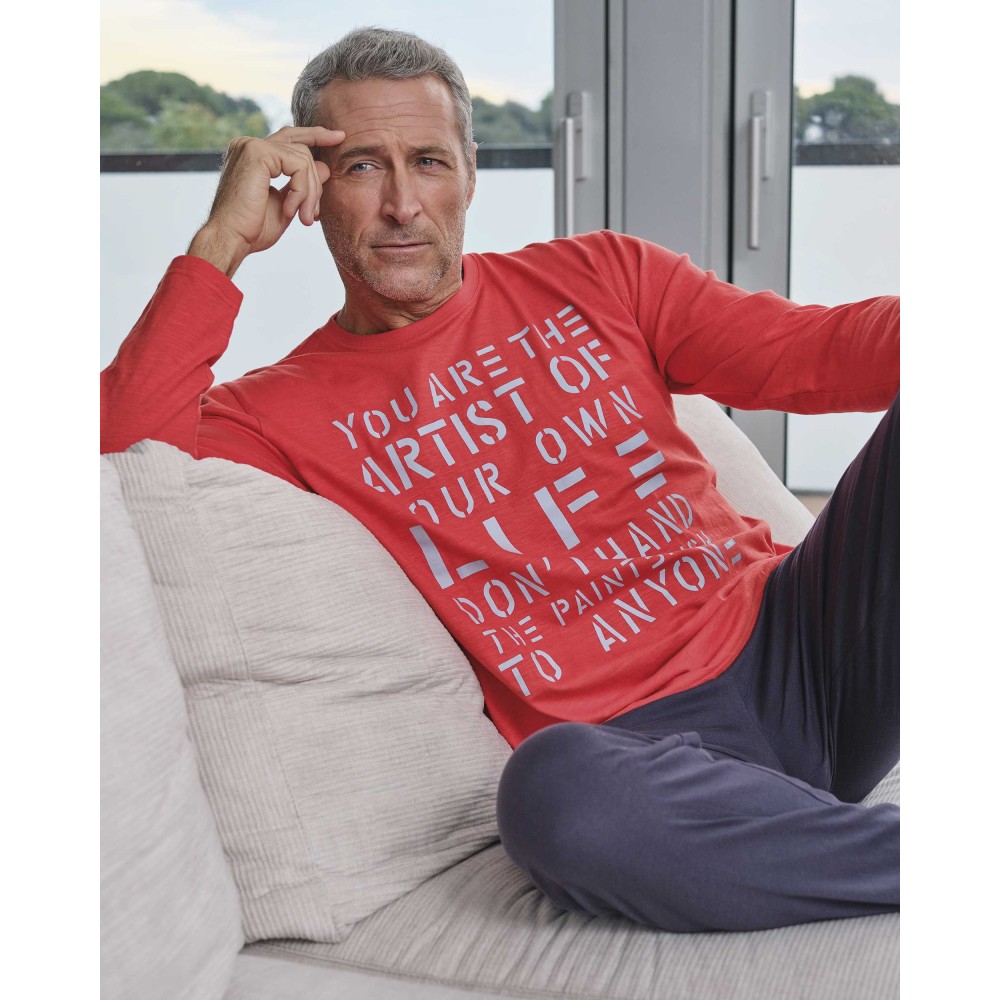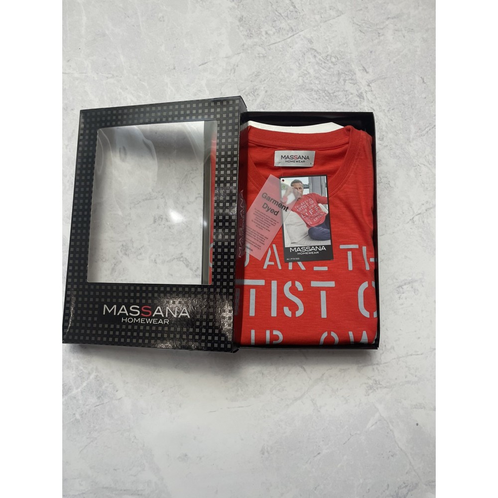 Піжама чоловічазі штанами Massana P731303 виготовлена ​​з високоякісної бавовни. Комплектскладається з джемпера з довгими рукавами червоного кольору та однотоннихштанів прямого крою.Склад: 100%бавовна.