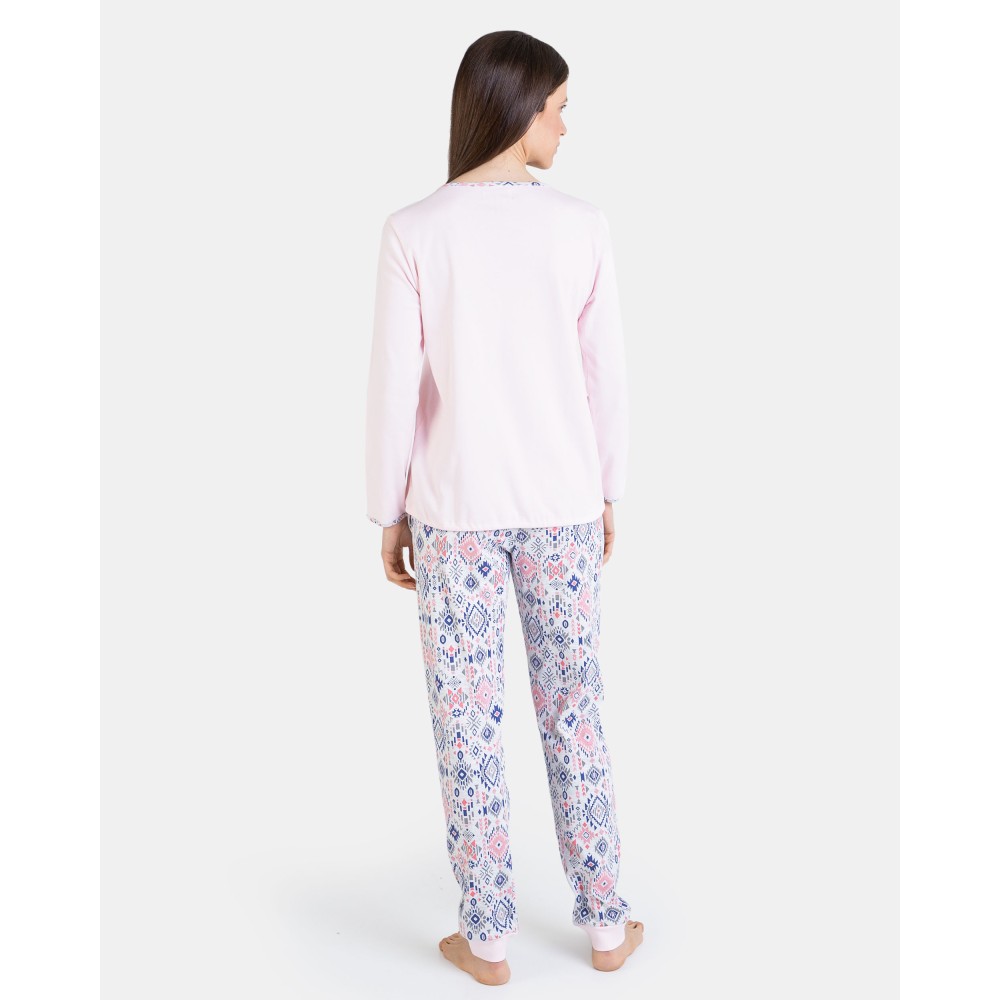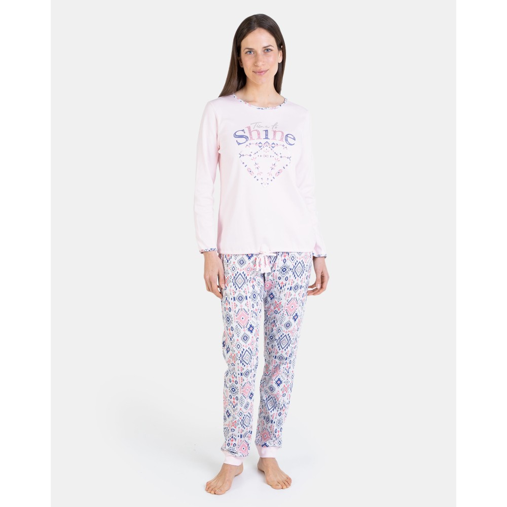 Жіноча піжама збрюками Massana P731207 з високоякісної бавовни. Комплект складається зджемпера з довгими рукавами, горловина та краї рукавів декоровані кольоровимкантом. Штани прямого крою з геометричним малюнком.Склад: 100%бавовна.