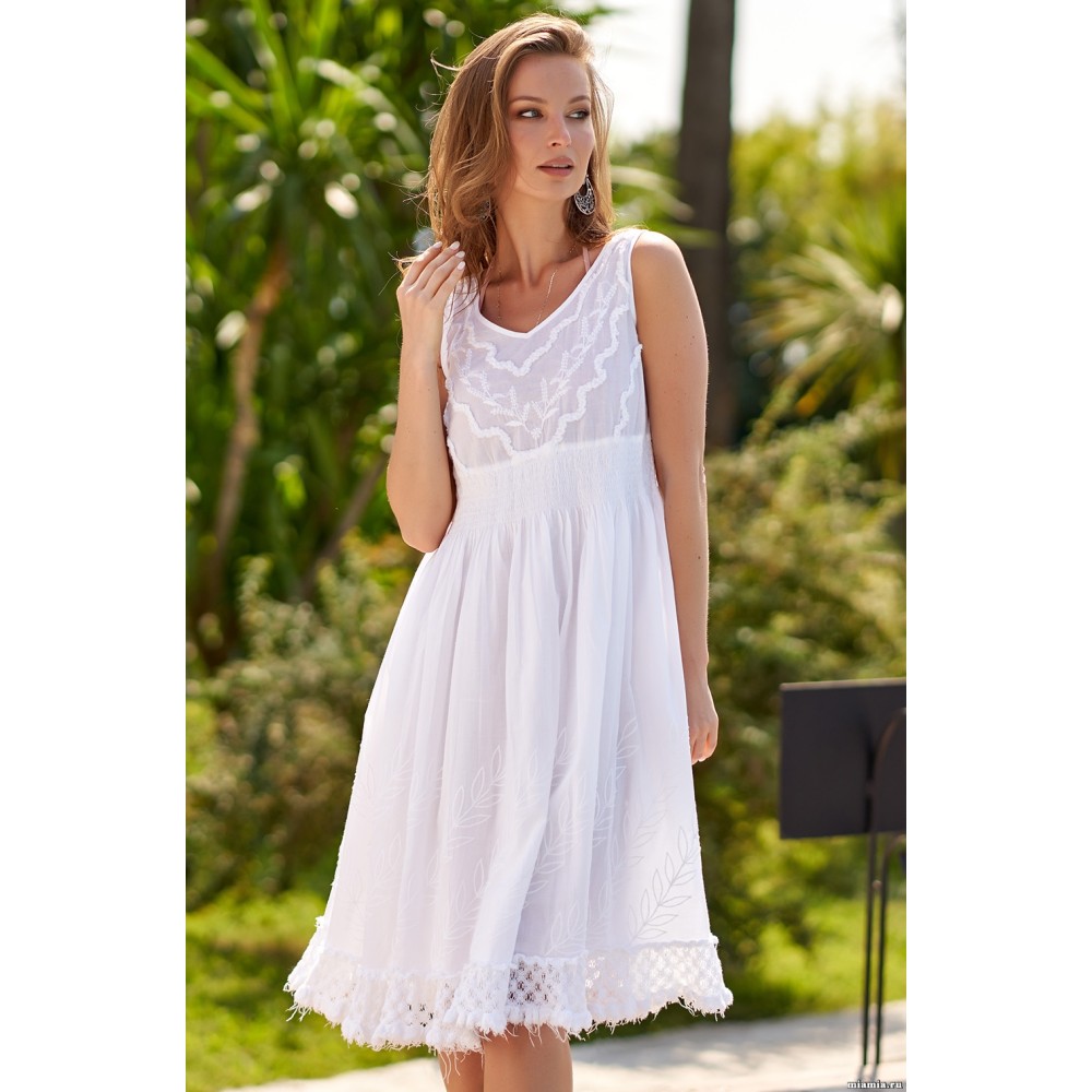 Пляжна сукня "Аргентина" 1376 від Mia-Amore виконана з бавовняного полотна. За талії сарафан прилягає по фігурі за рахунок рядків м'якої еластичної тасьми. Ліф декорований рюшів. Низ виробу виконаний з в'язаного мереживного полотна. Сарафан на підкладці з тонкої бавовни. Склад: 100% бавовна.