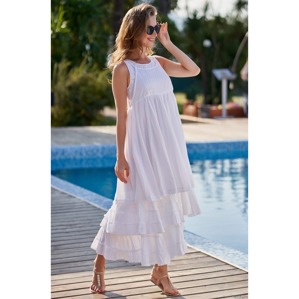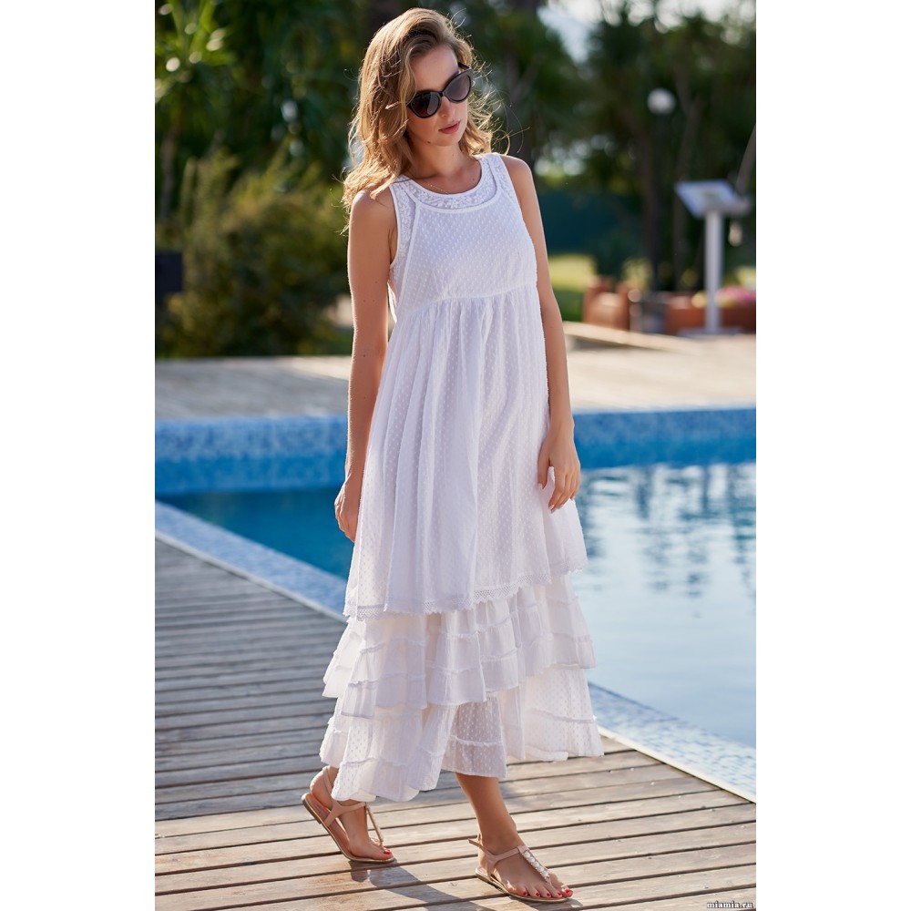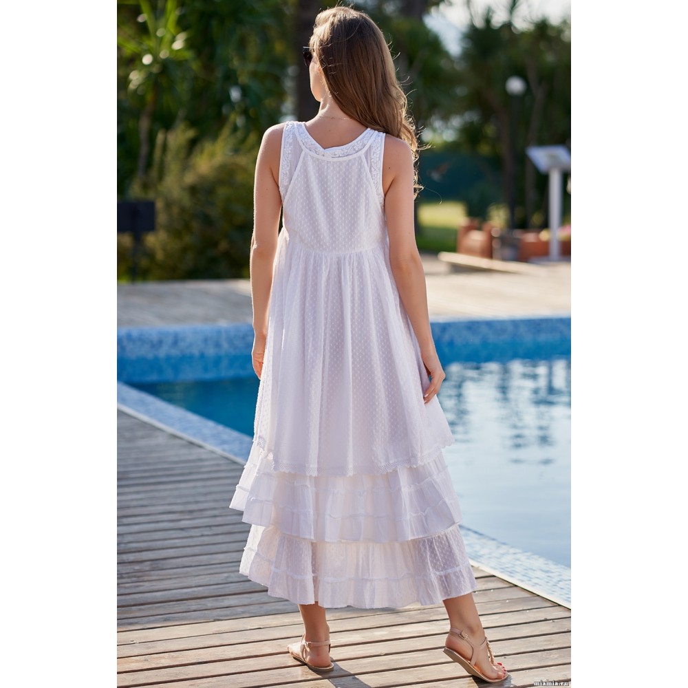 Пляжна сукня "Аргентина" 1378 Mia-Amore без рукавів з бавовняного полотна на широких бретелях. Відрізняє оригінальна конструкція - відрізний ліф сукні виконаний у вигляді накладення верхнього топа на тонких бретелях на нижній. Яруси нижньої частини сукні декоровані мереживом і вишивкою у вигляді декількох шарів спідниці. Склад 100% бавовна