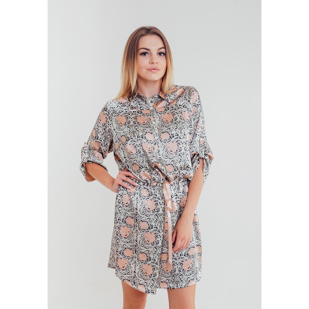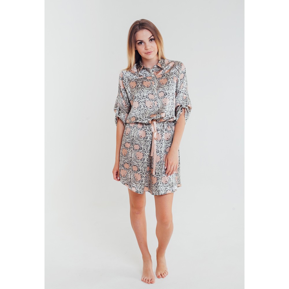 Стильна сорочка "Діор" 15086 від Mia-Mia (Італія) середньої довжини з 100% натурального шовку. Сорочка з рукавом реглан, на рукаві хлястик застібається на гудзики з петлею, для коригування довжини рукава. Сорочка з талії з куліскою і поясом. Склад: 100% натуральний шовк.