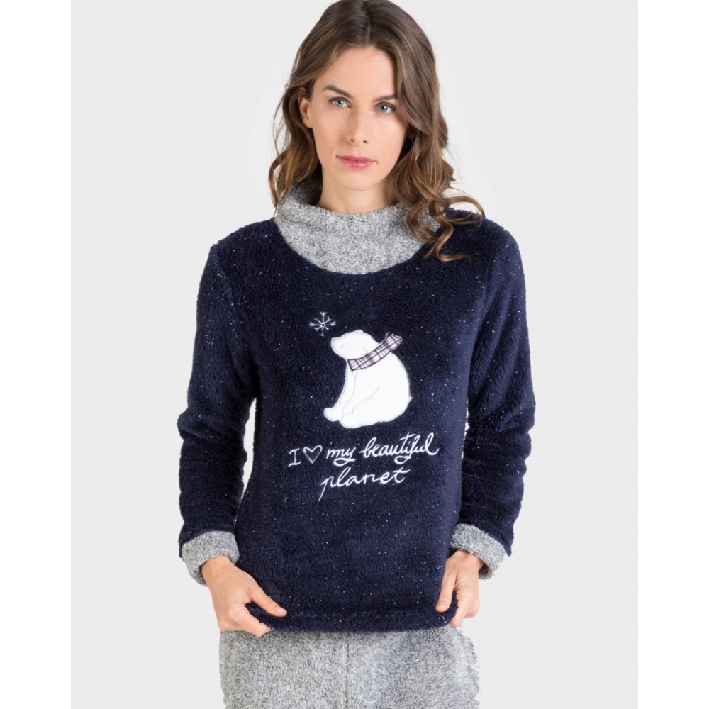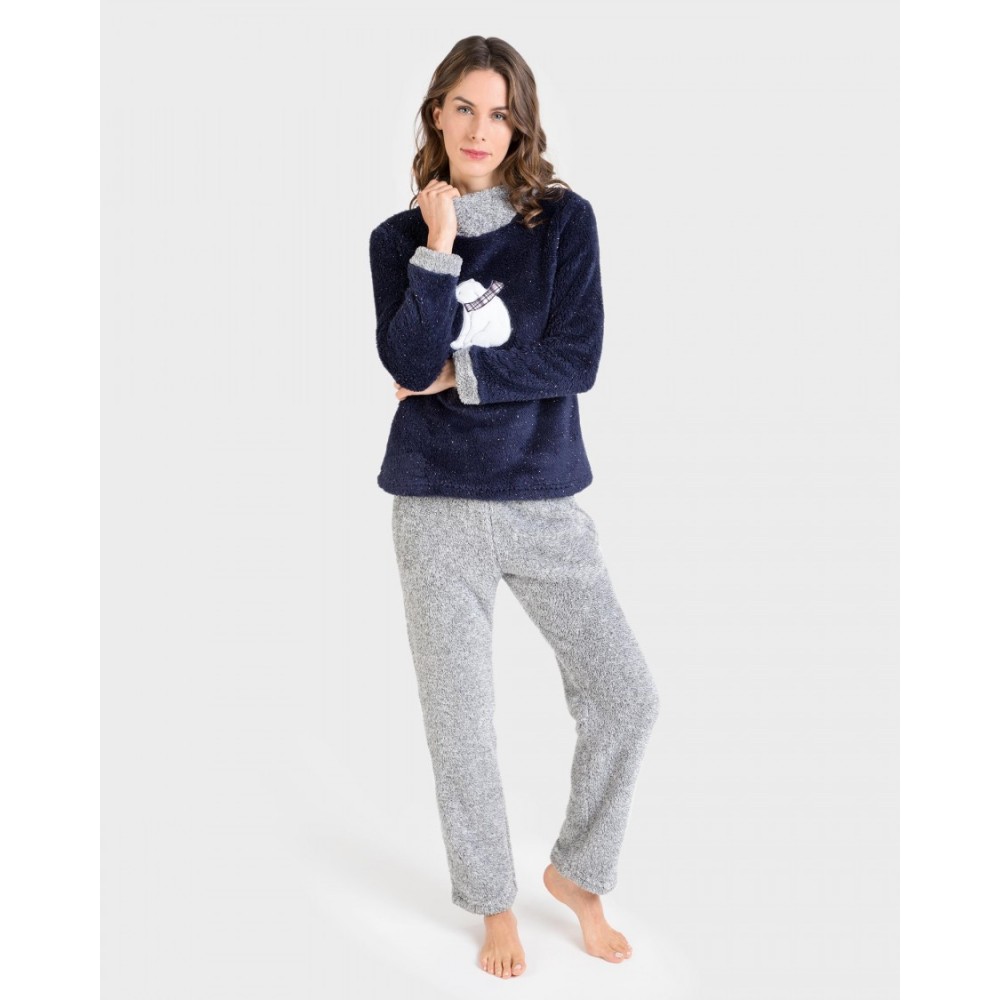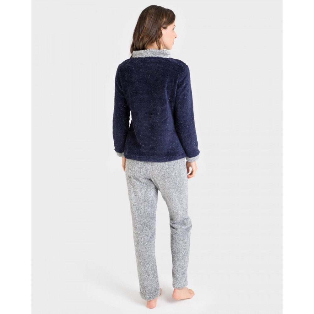 Жіночий домашній комплект P701235 від іспанського бренду Massana. Костюм складається з кофти з довгим рукавом темно-синього кольору. Висока горловина і краю рукавів виготовлені з тканини компаньйона в колір брюк. Штани прямого силуету сірого кольору. Склад: 100% поліестер.