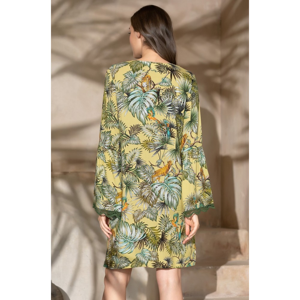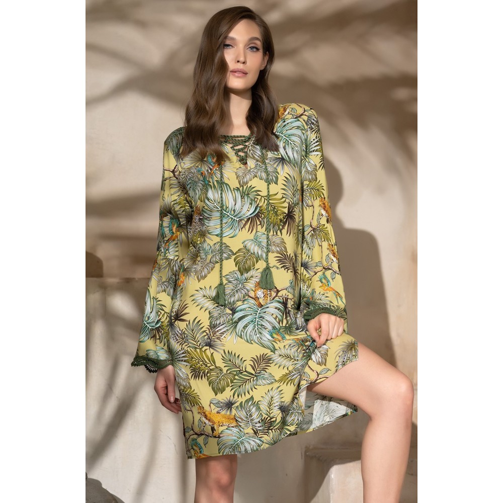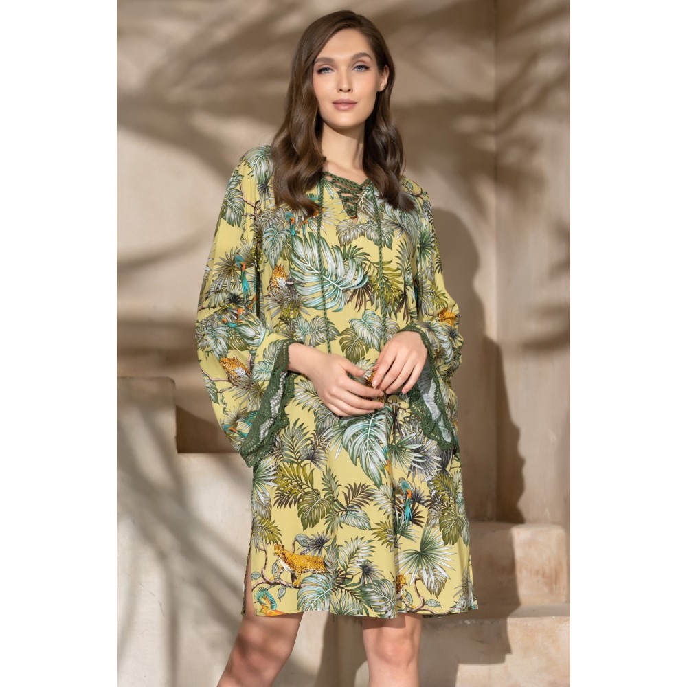 Туніка Сафарі 1805 від Mia-Amore вільного силуету здовгим широким рукавом, виготовлена ​​з тканої принтованої віскози. Довжинатуніки трохи вище колін. Ширину V-подібного вирізу можна регулювати за рахунокшнурування. Низ рукавів оброблений декоративною тасьмою. З боків туніки обробленокишені. Розрізи внизу виробу забезпечують додаткову свободу руху.Склад: 100% віскоза.