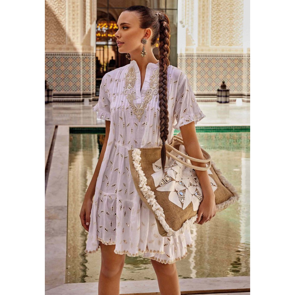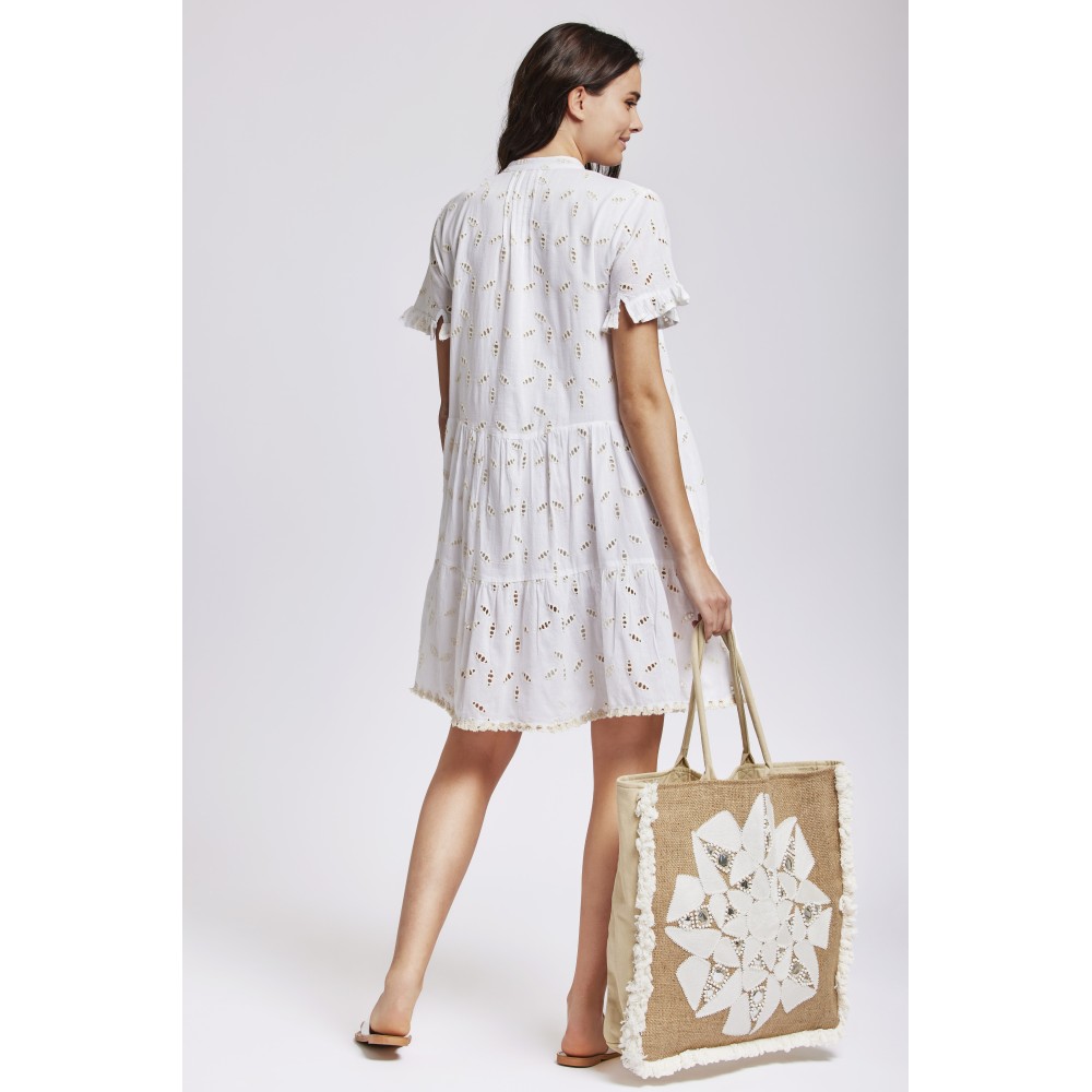 Туніка-сукня Iconique IC24-013 вище колін виготовлена ​​звисокоякісної бавовни. Рукав короткий і розкльошений по краях область декольтедекорована вишивкою. Горловина має V-подібну форму.Склад: Бавовна 100%