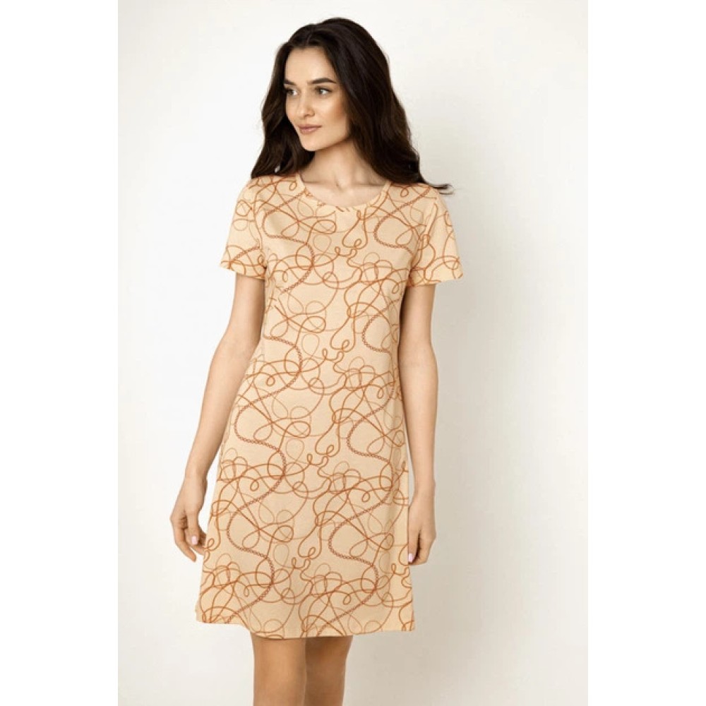 Женская ночная рубашка торговой марки Jasmine с коротким рукавом выполнена из качественного хлопка светло-бежевого цвета в абстрактный принт в виде перепутанных волнистых линий коричневого и золотистого цветов;