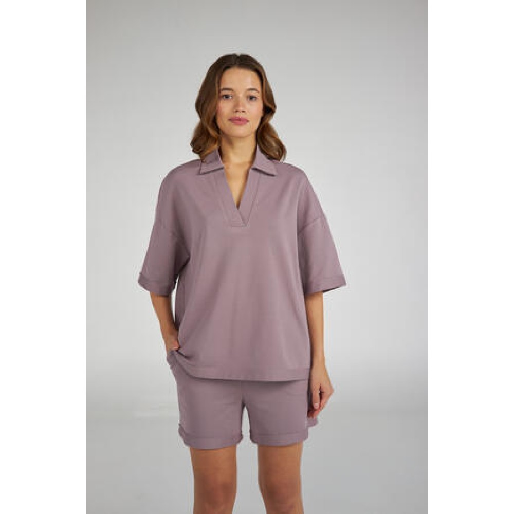 Женская пижама торговой марки Ellen украинского производства выполнена из хлопка высокого качества сиреневого цвета, состоящая из поло свободного покроя и коротких шорт;