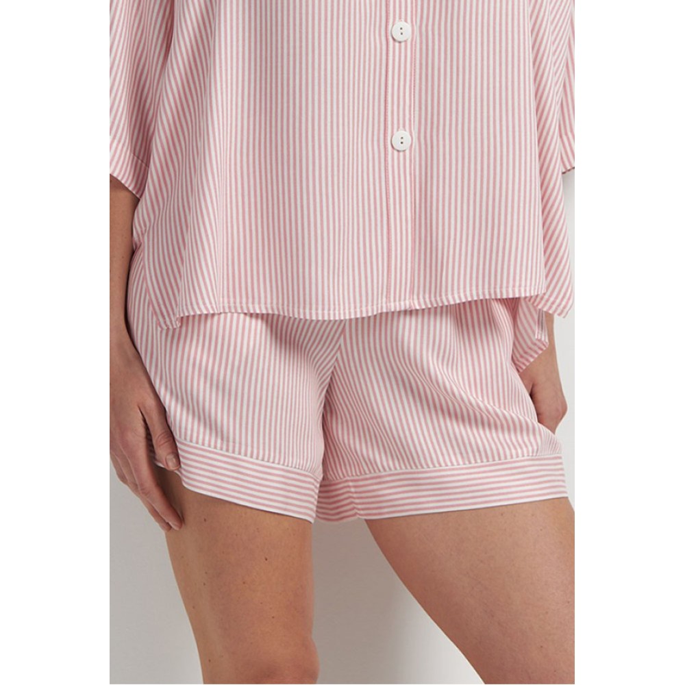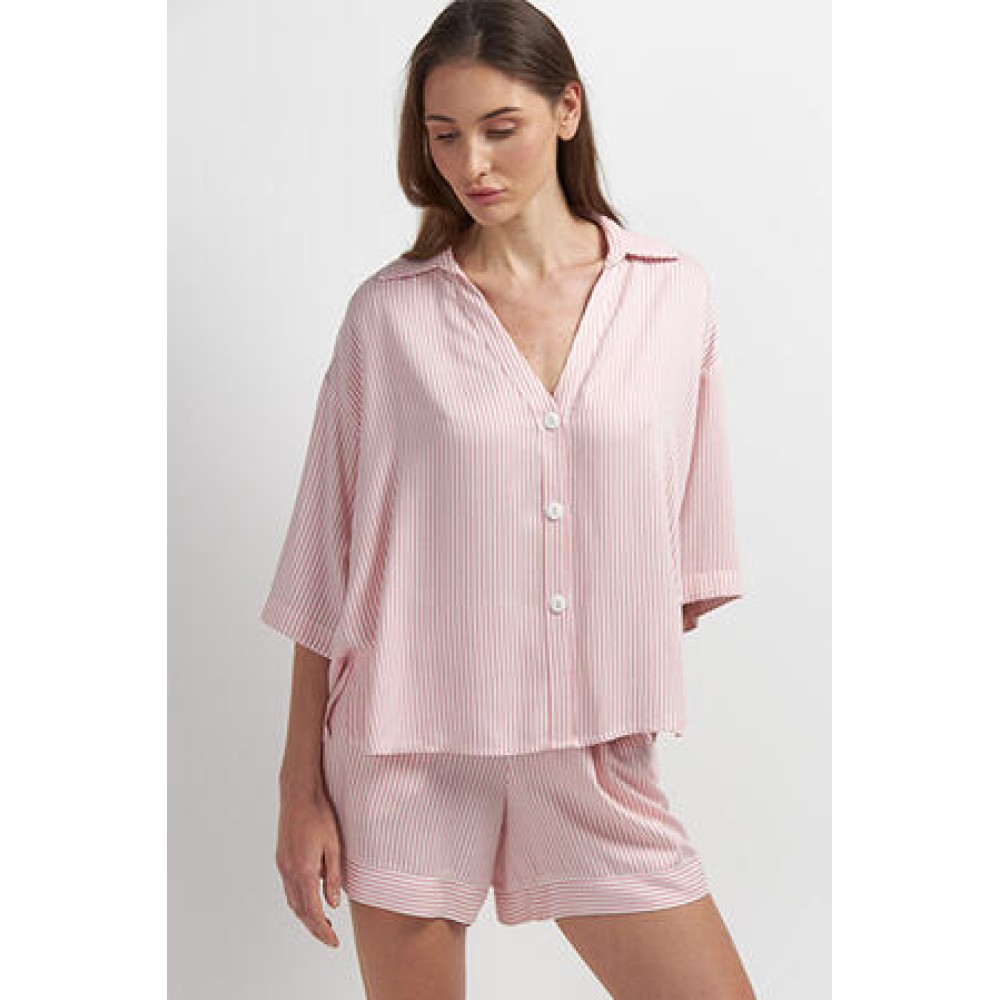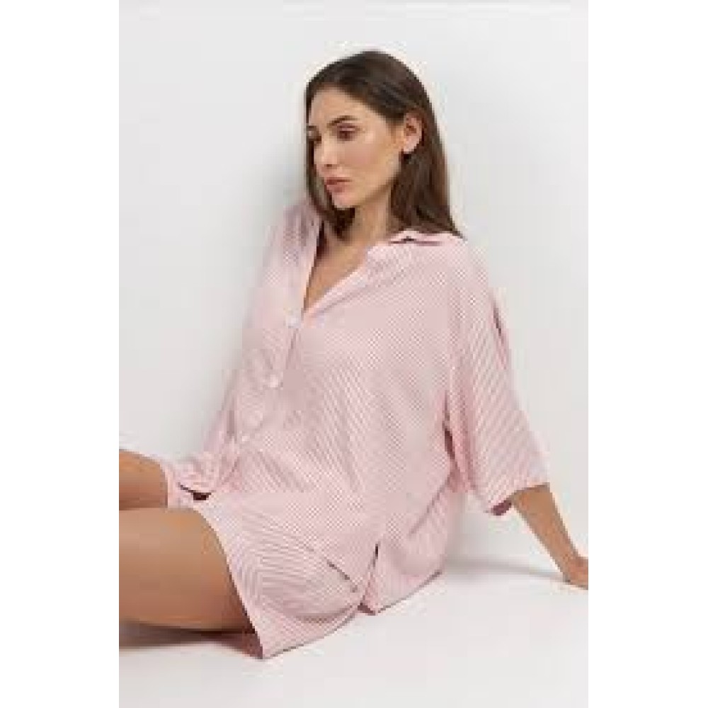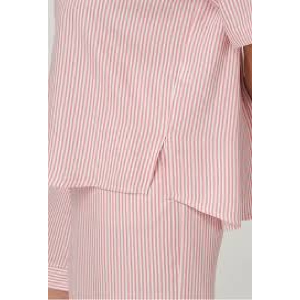 Женская пижама большого размера торговой марки Ellen украинского производства выполнена из хлопка высокого качества светло-розового цвета в белую вертикальную полоску, состоящая из рубашки свободного покроя и коротких шорт;