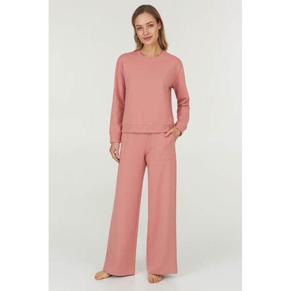 Женский домашний костюм торговой марки Ellen украинского производства выполнена из хлопка высокого качества розового цвета, состоящий из лонгслива с длинным рукавом на манжетах и прямых брюк;