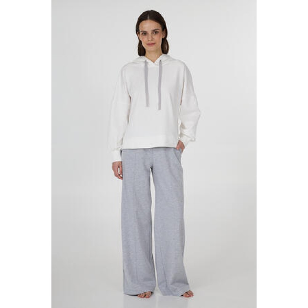 Женский домашний костюм торговой марки Ellen украинского производства выполнена из хлопка высокого качества, состоящий из лонгслива с длинным рукавом на манжетах белого цвета и прямых брюк серого цвета;